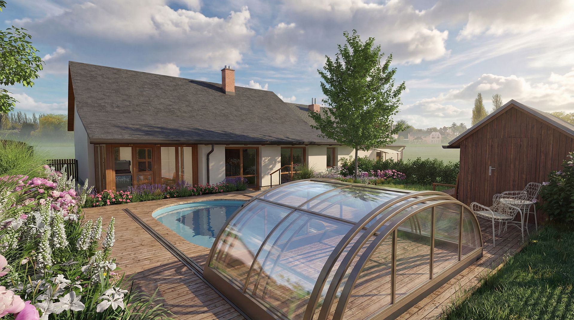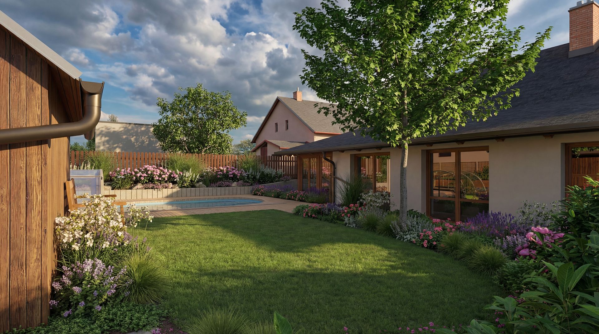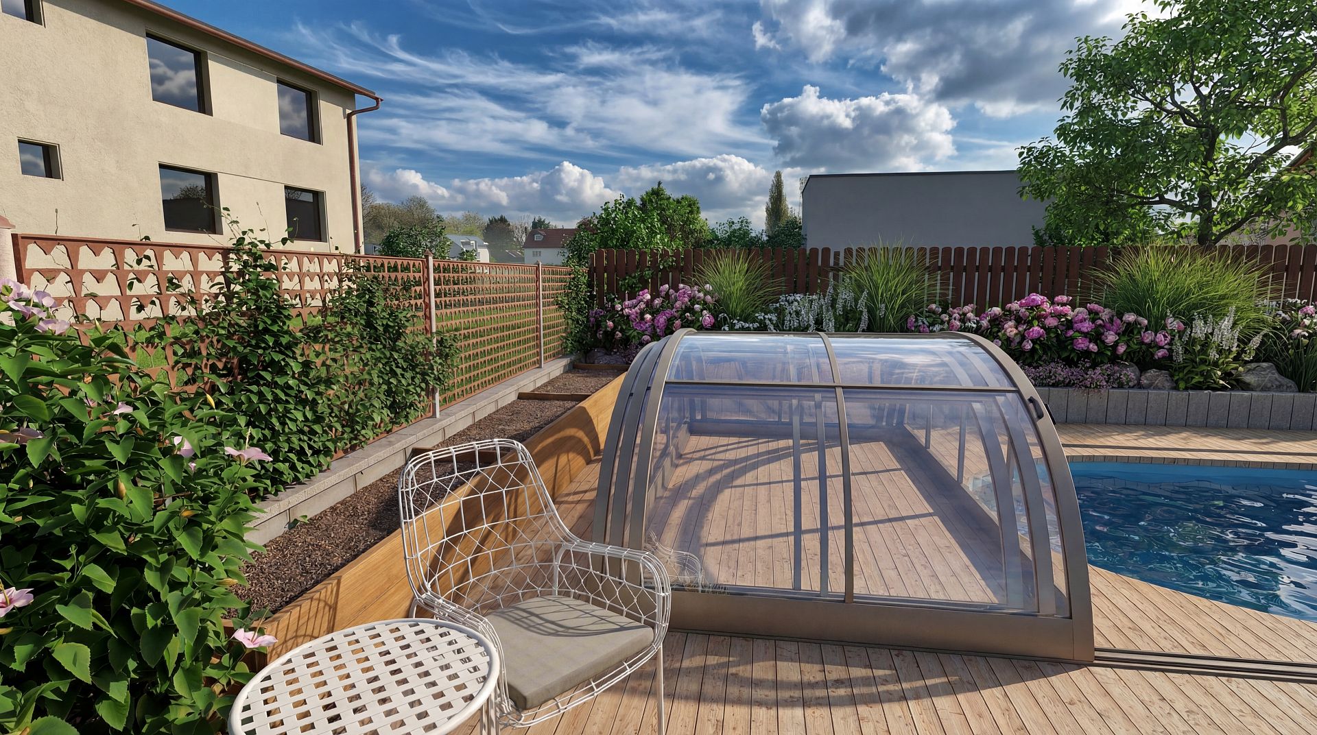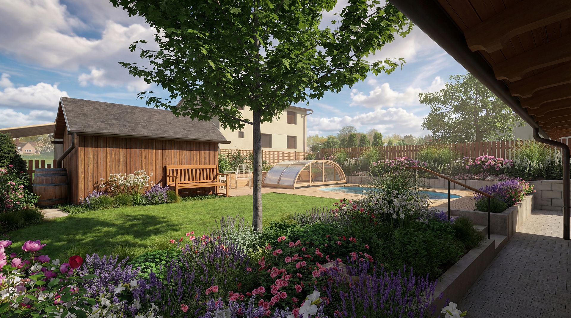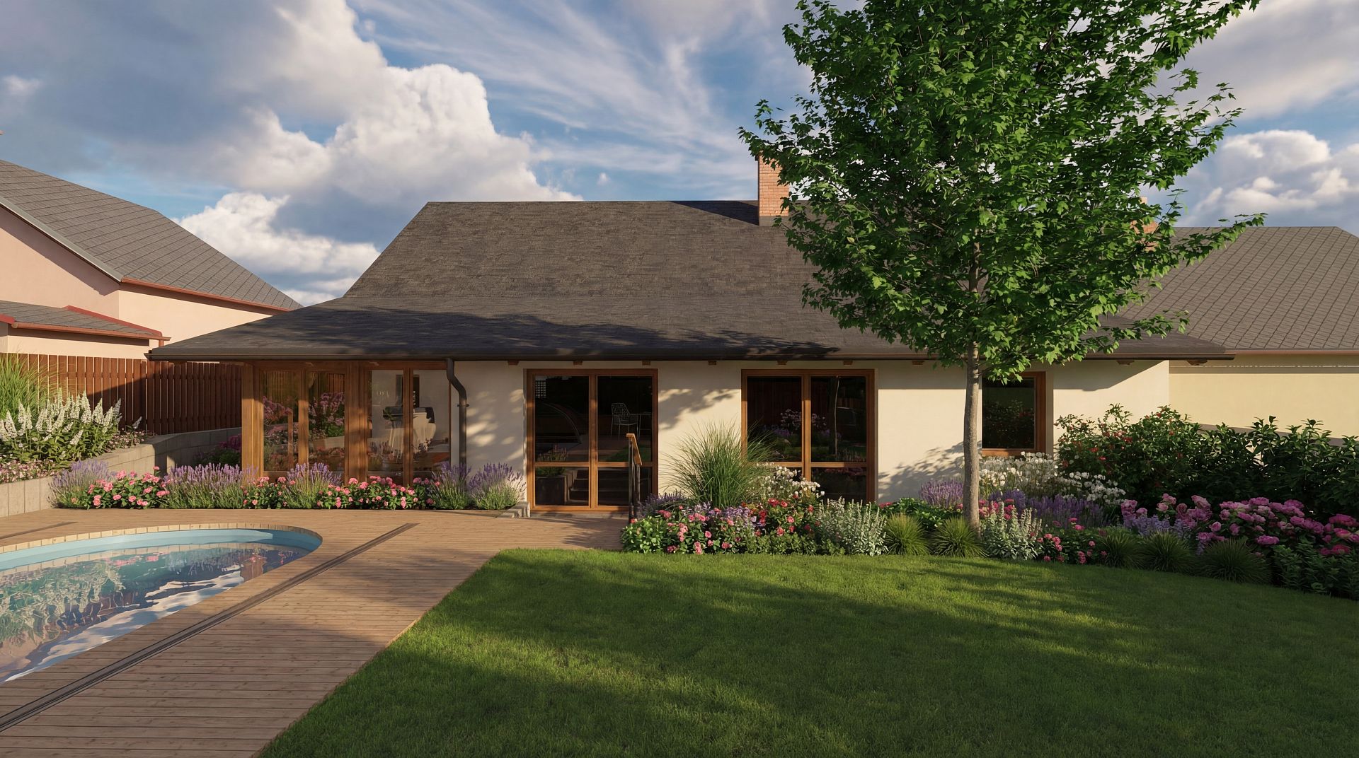 U stávajícího bazénu jsme navrhli nový elegantní kryt a do jeho okolí komfortnější dřevěnou terasu, která nahradí původní dlažbu zarůstající plevelem. V těsné blízkosti bazénu vzniknou vyvýšené záhony pro bylinky a zeleninu, zatímco centrální část zahrady bude tvořit trávník pro venčení domácích mazlíčků. Nově navržený listnatý strom vnáší do kompozice stín a zlepšuje mikroklima, přičemž esteticky propojuje relaxační zónu s okolní výsadbou.