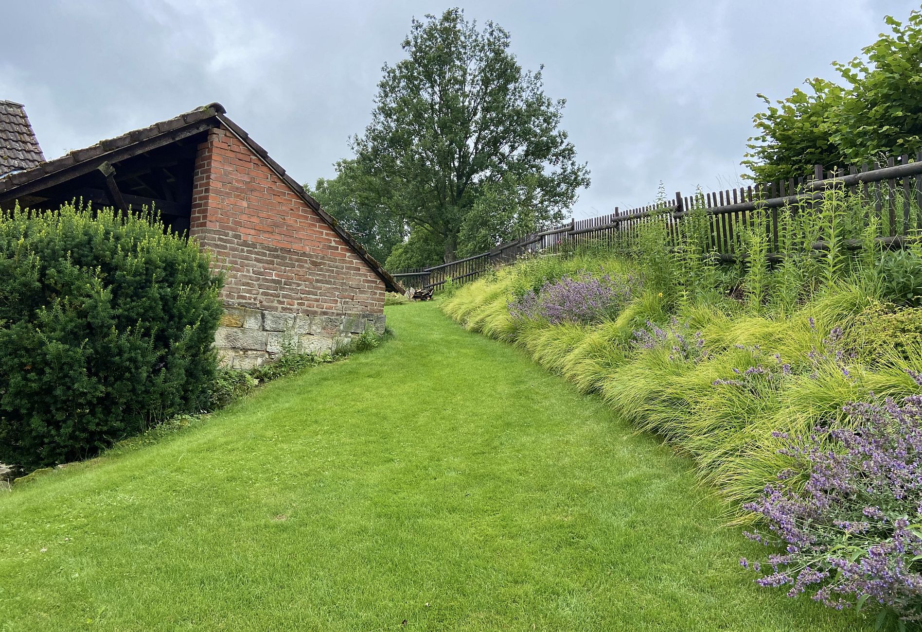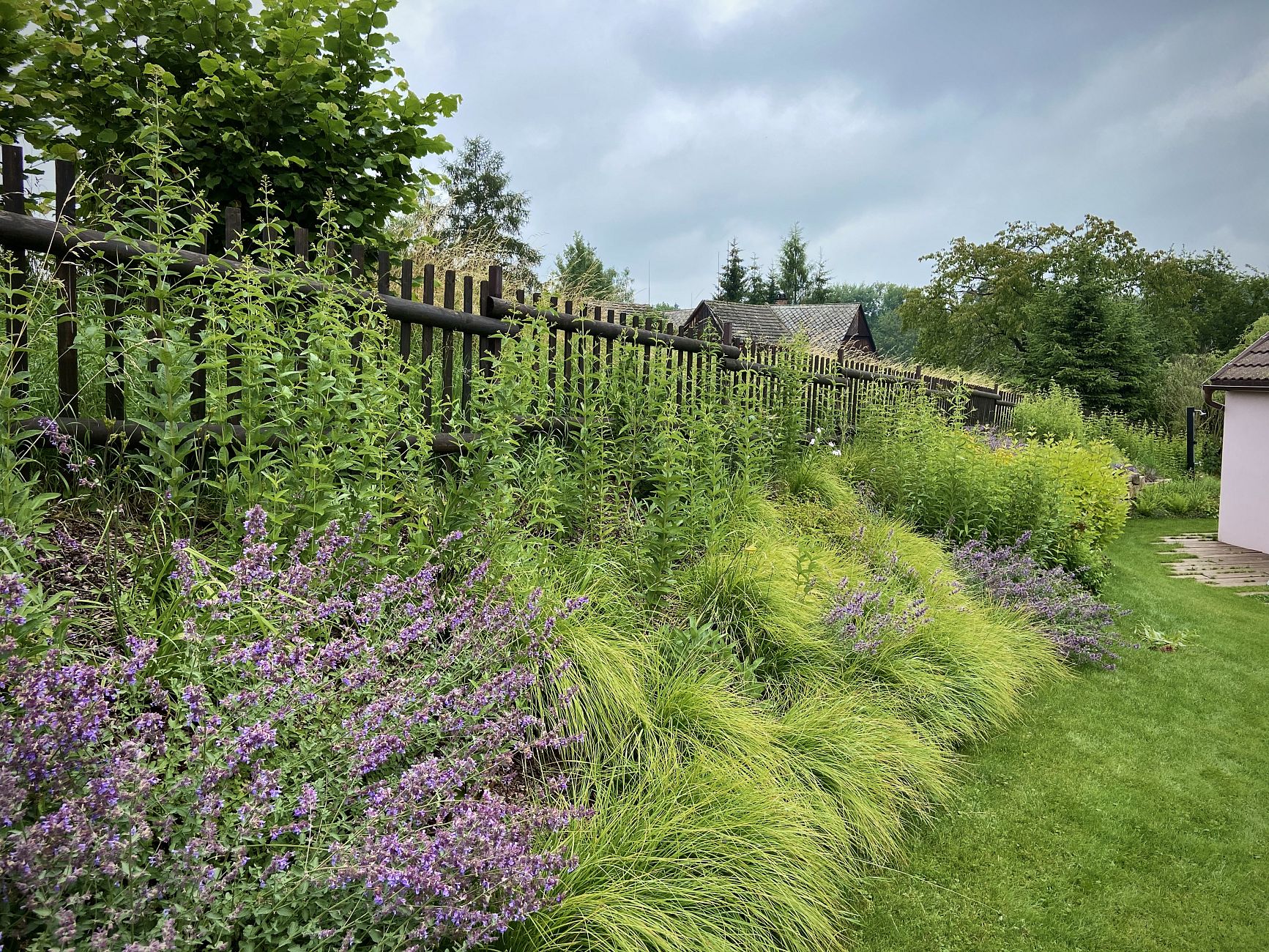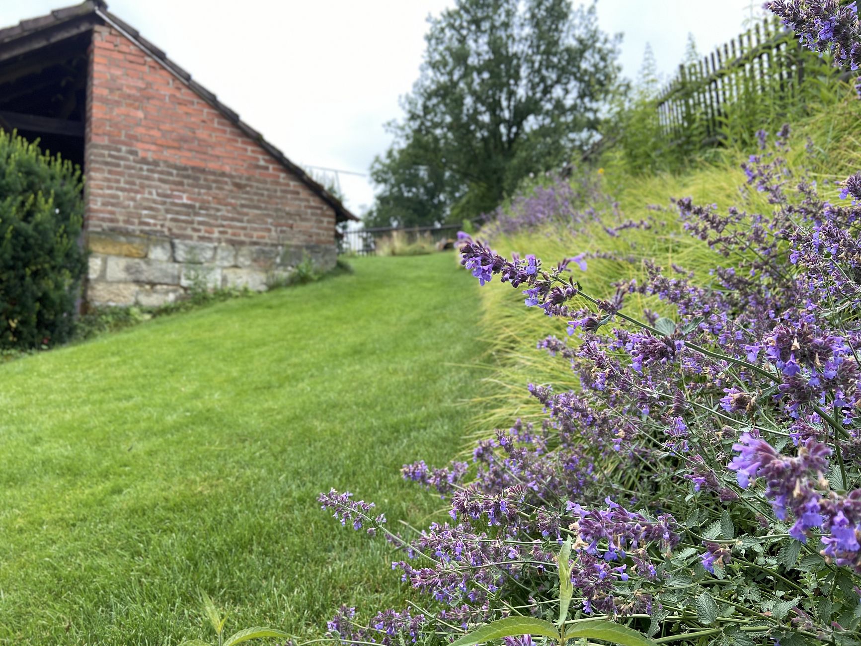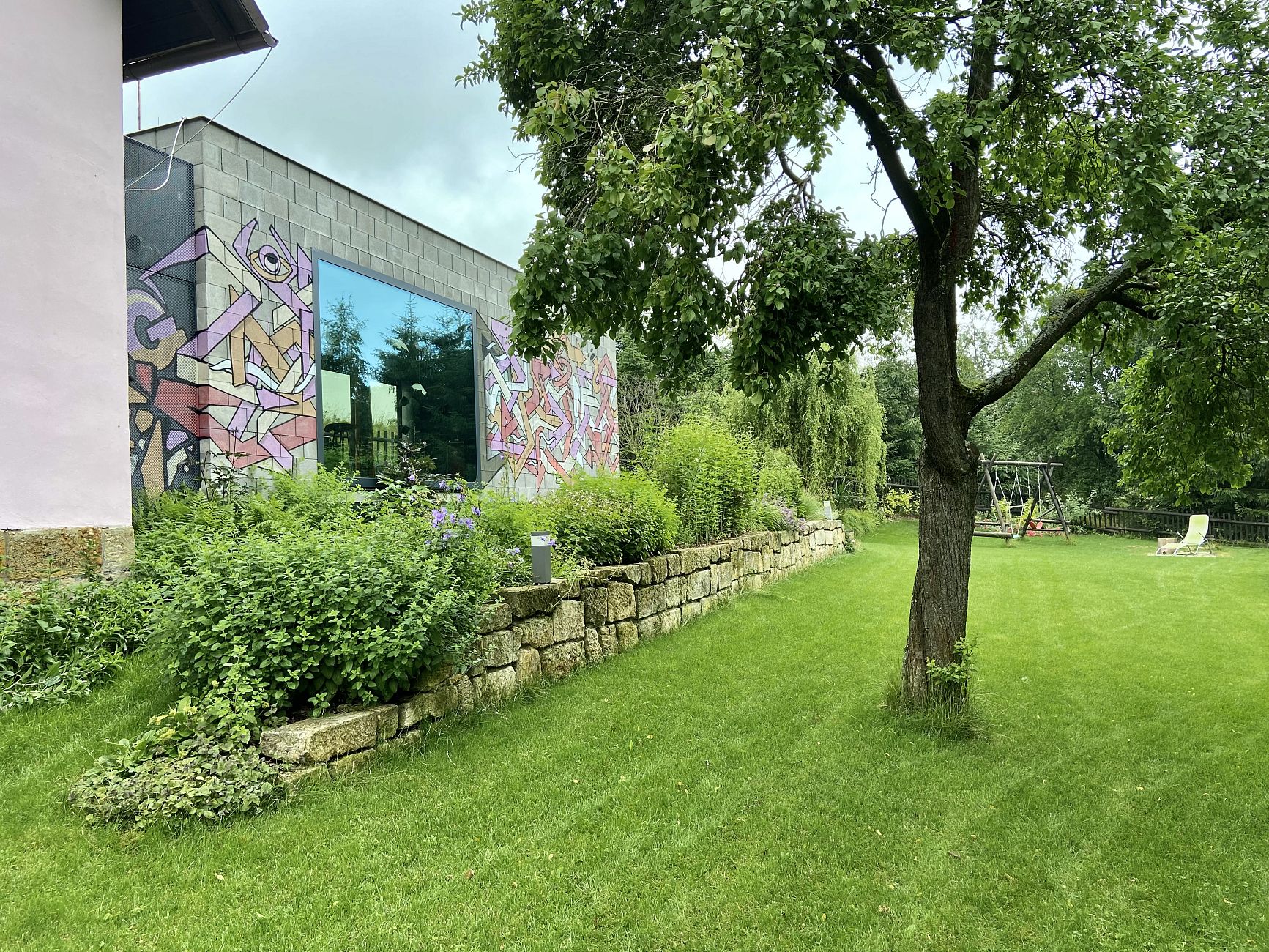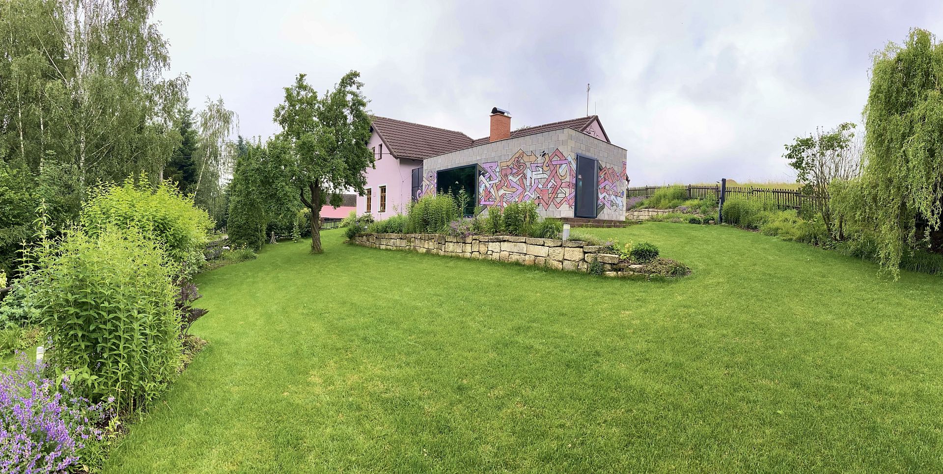 Důležitou součástí návrhu bylo propojení moderní přístavby domu s původním venkovským stylem zahrady. Zatímco architektura přístavby pracuje s výraznými moderními prvky, samotná zahrada zachovává tradiční venkovský charakter. Výsledkem je harmonický celek, který propojují pastelové barvy a dokonale upravená svažitá zahrada.