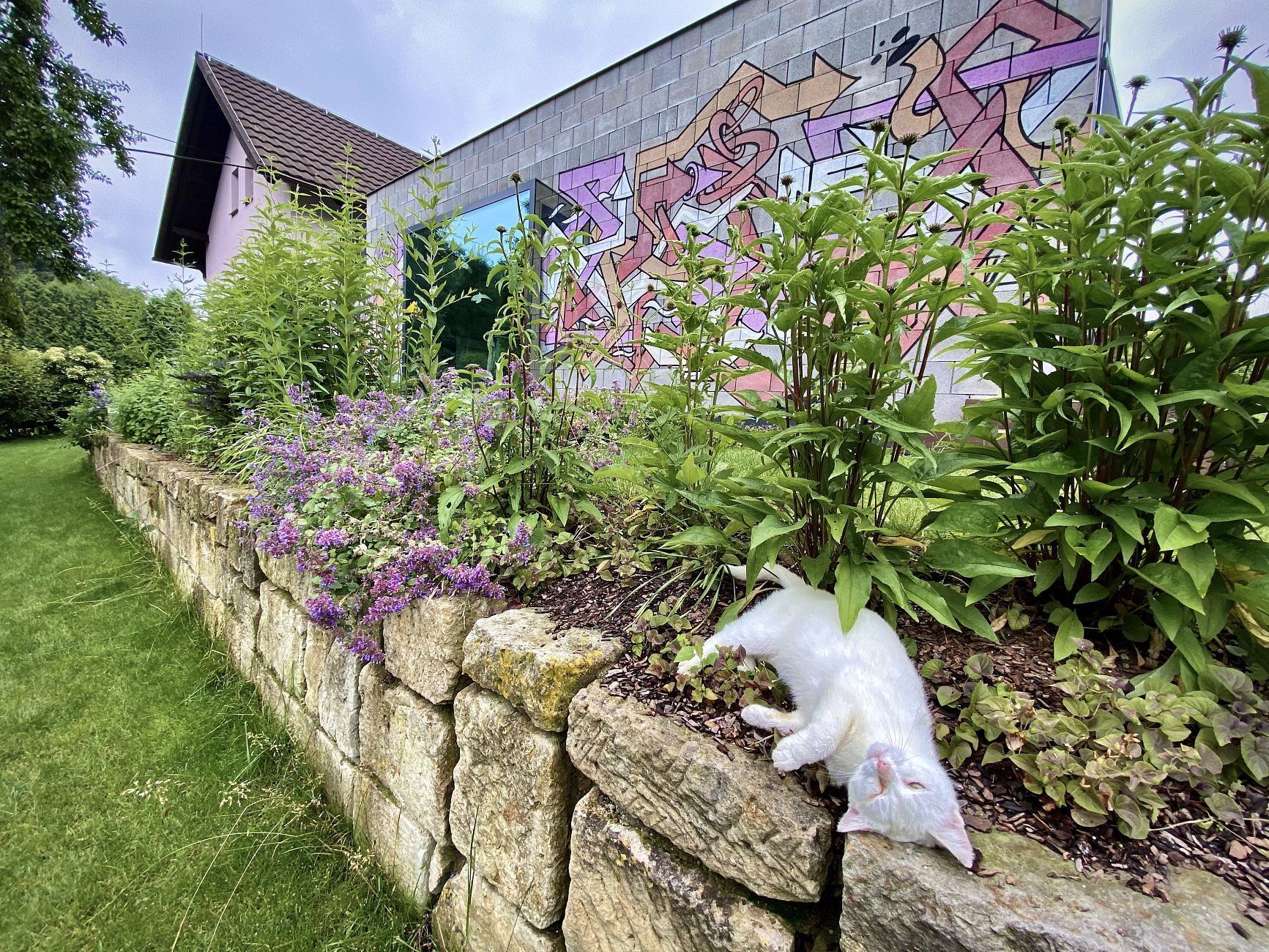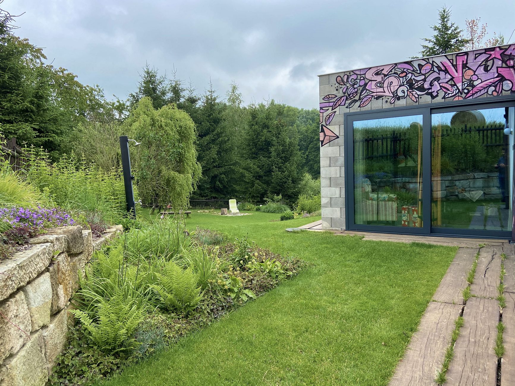 V Dubenci jsme realizovali zahradu u rodinného domu, kde bylo hlavním cílem citlivě vyřešit osázení pozemku rostlinami a převýšení svahů na pozemku. Zároveň bylo potřeba propojit tradiční charakter venkovské zahrady s moderní přístavbou domu, jejíž fasádu tvoří graffiti. Klientka si přála vytvořit funkční, estetickou a příjemnou zahradu, která nabídne prostor pro relaxaci, ochlazení v letních měsících i večerní posezení.