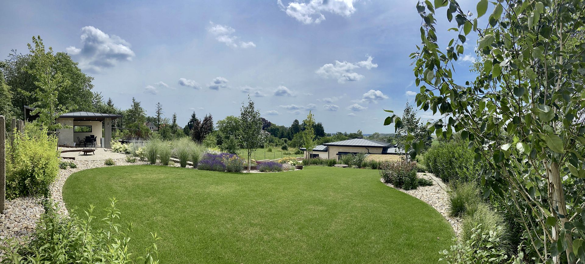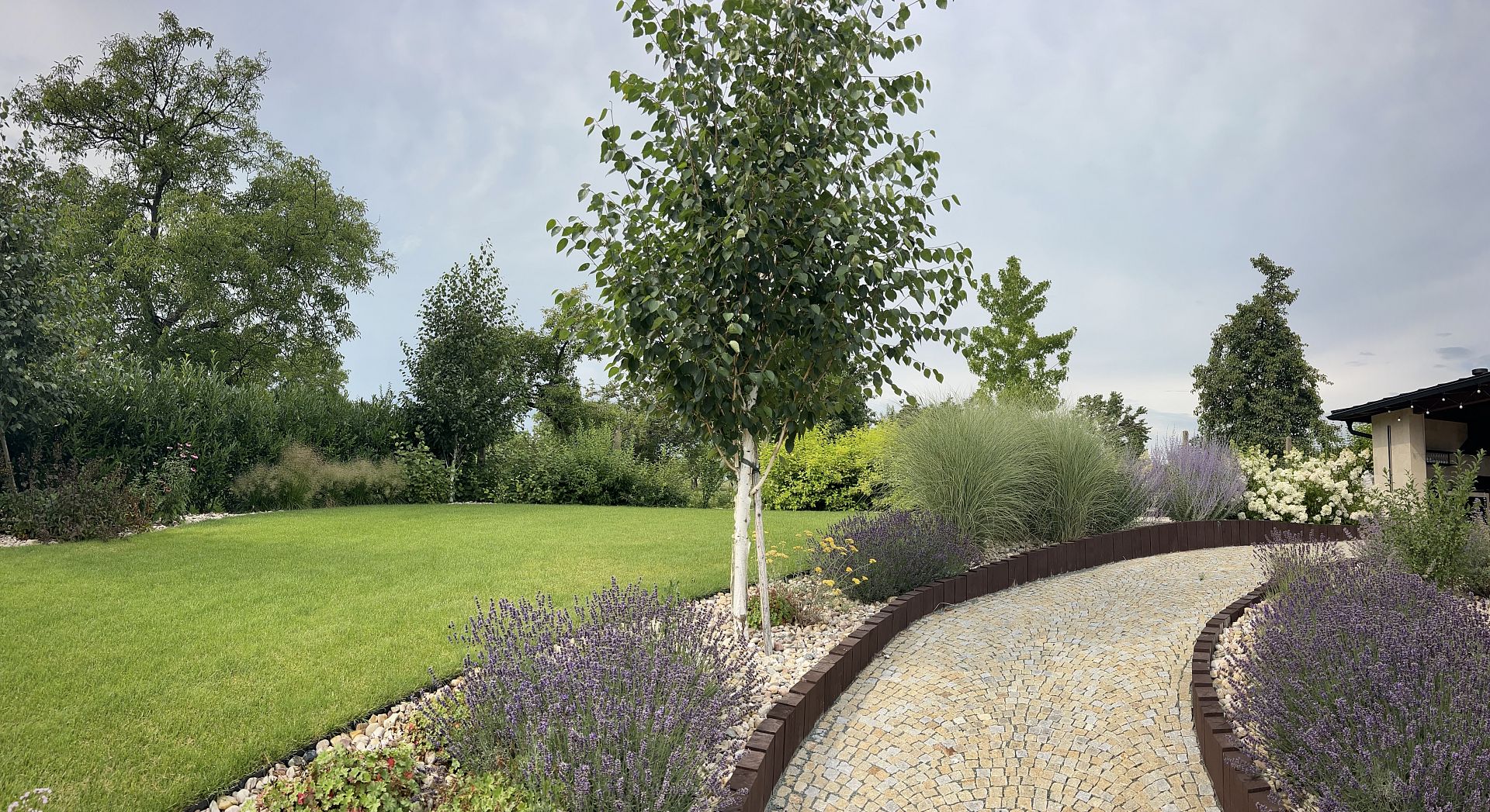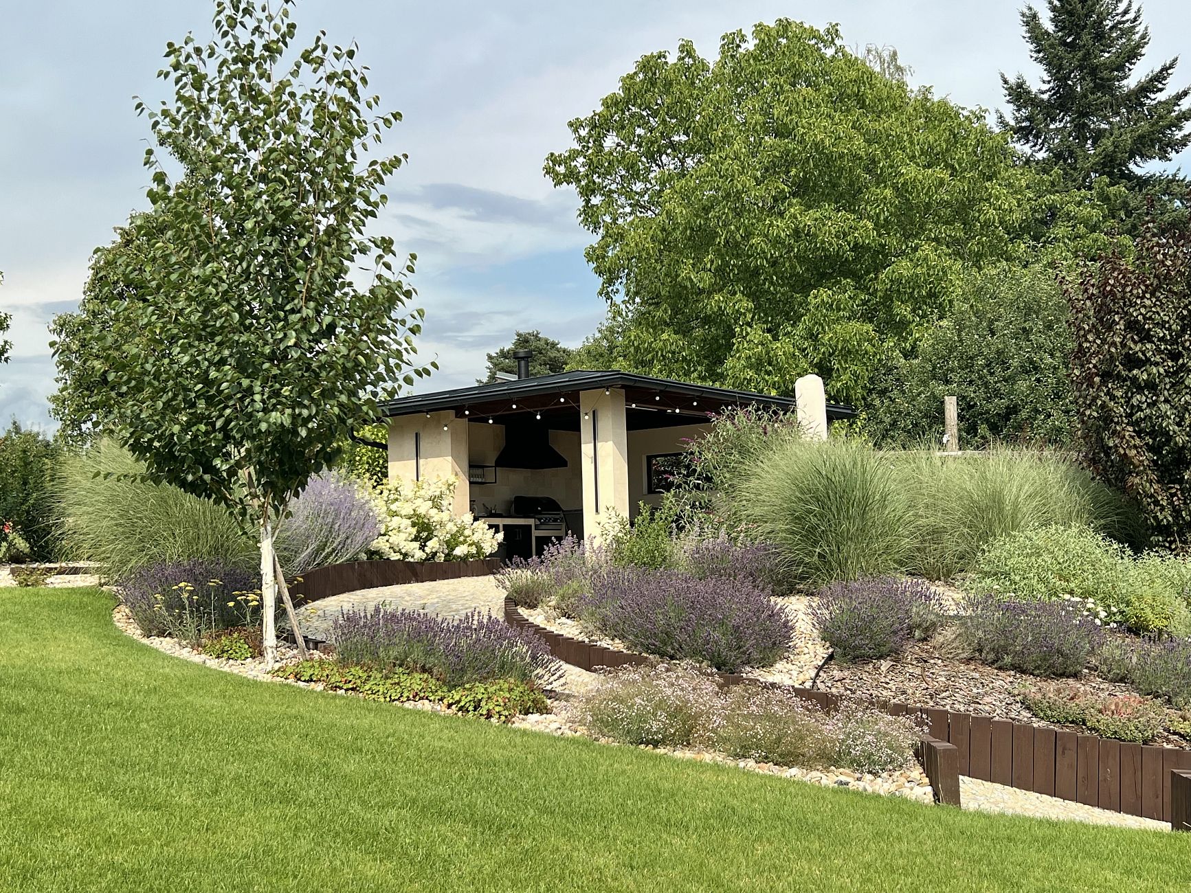 Do horní části zahrady jsme navrhli zděnou zahradní pergolu s venkovní kuchyní, která nabízí příjemné posezení s výhledem do celé zahrady. K pergole vede klikatá zahradní cestička z dlažebních kostek, která nejen propojuje jednotlivé části pozemku, ale zároveň podtrhuje přirozený charakter zahrady. Výsledkem je funkční, estetická a snadno udržovatelná zahrada, která maximálně využívá potenciál svažitého pozemku.