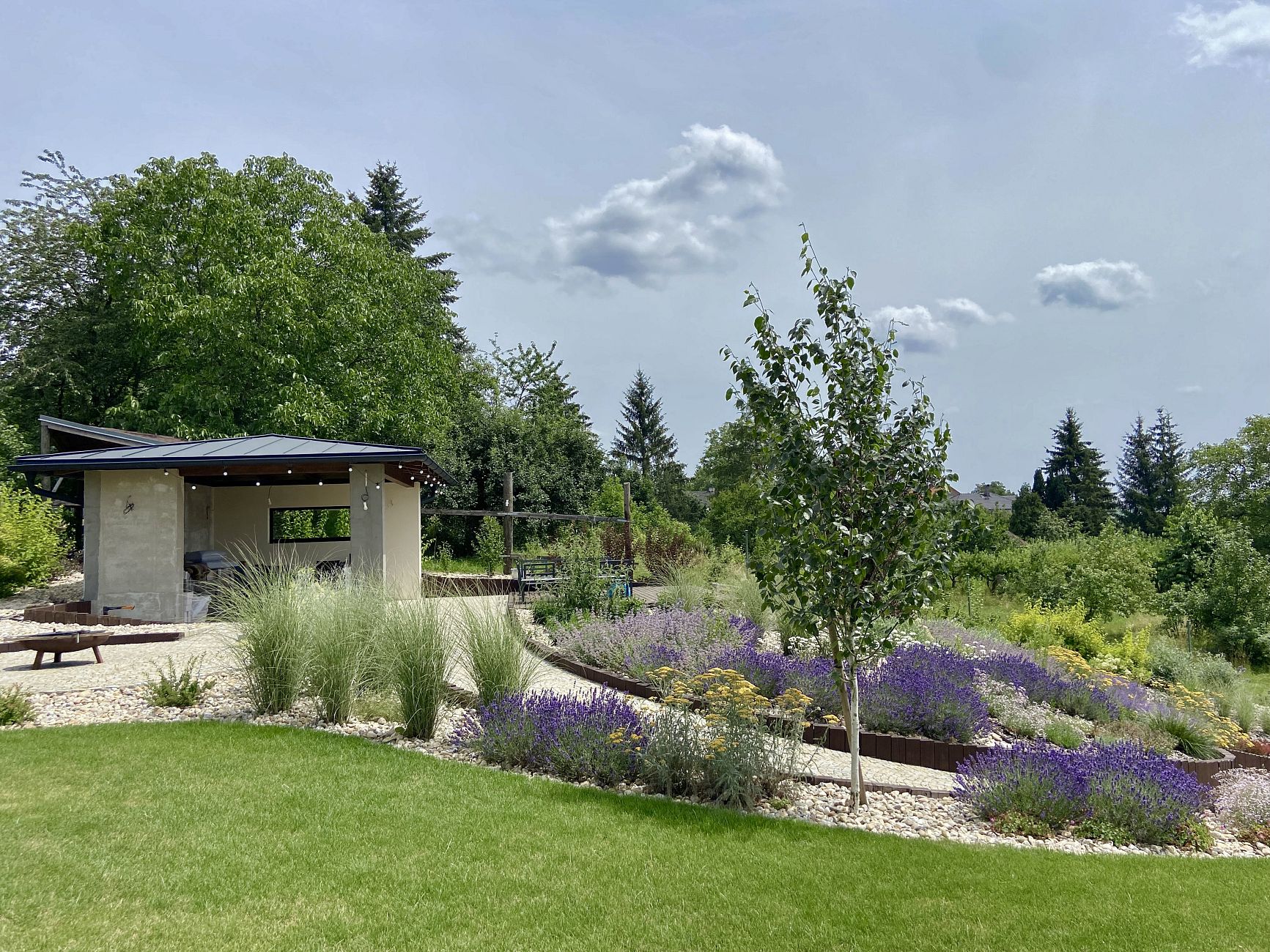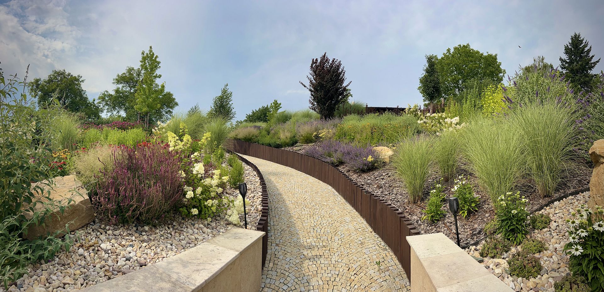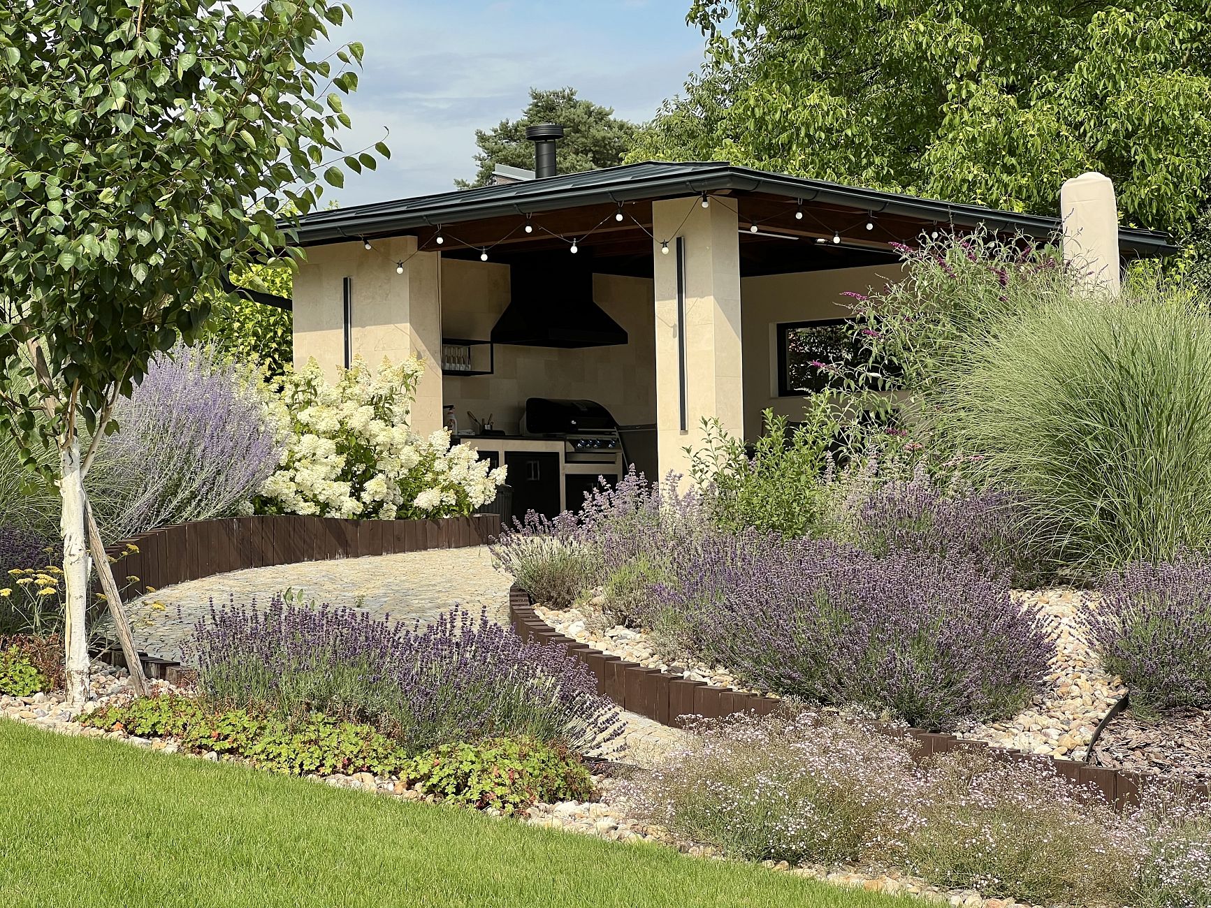 Do horní části zahrady jsme navrhli zděnou zahradní pergolu s venkovní kuchyní, která nabízí příjemné posezení s výhledem do celé zahrady. K pergole vede klikatá zahradní cestička z dlažebních kostek, která nejen propojuje jednotlivé části pozemku, ale zároveň podtrhuje přirozený charakter zahrady. Výsledkem je funkční, estetická a snadno udržovatelná zahrada, která maximálně využívá potenciál svažitého pozemku.