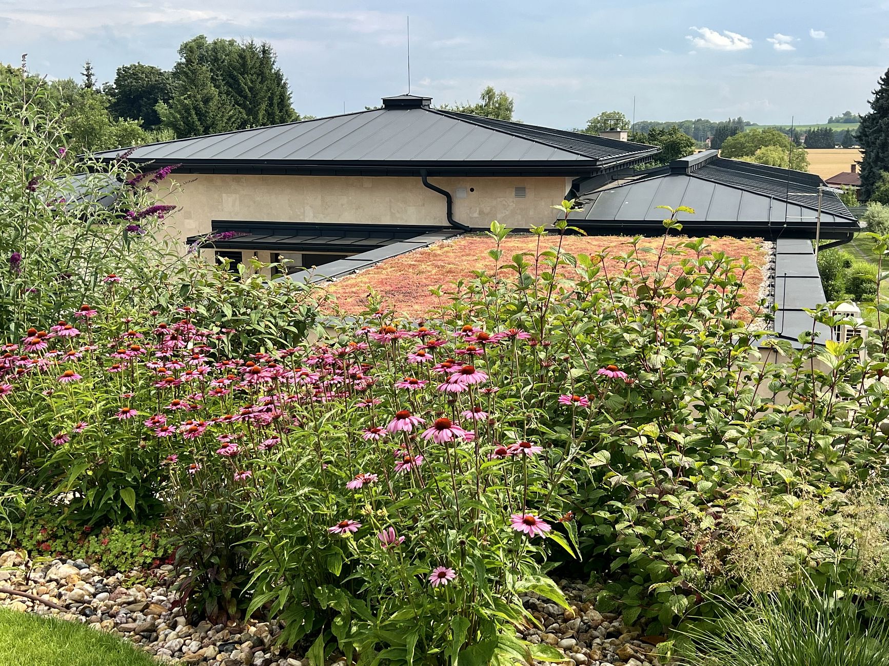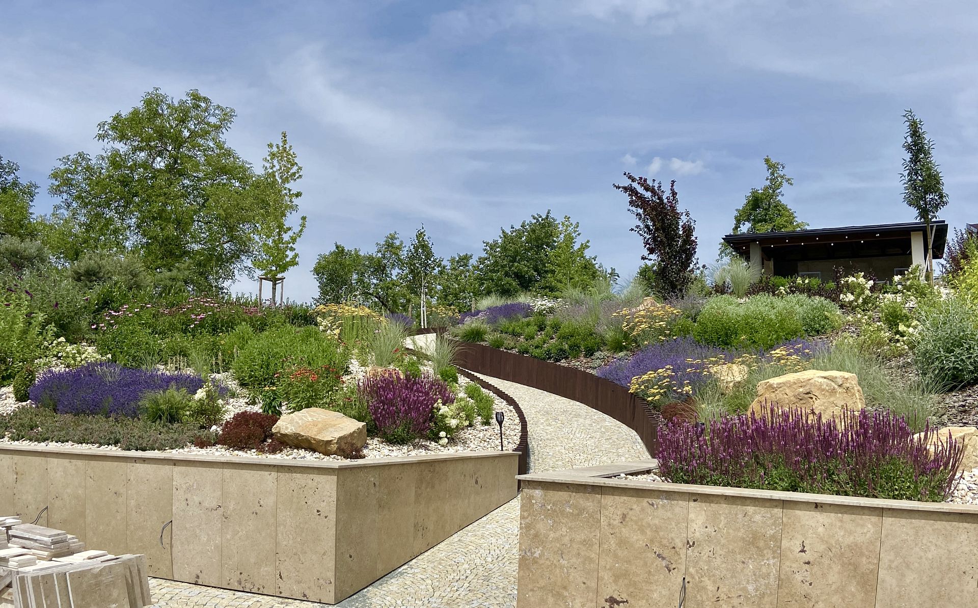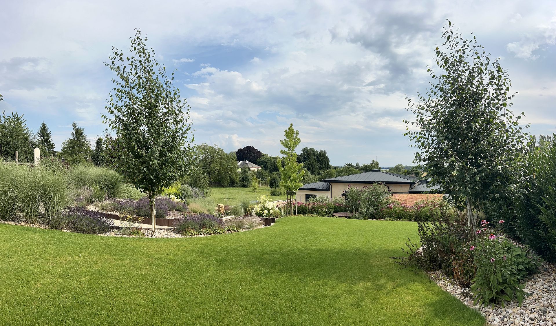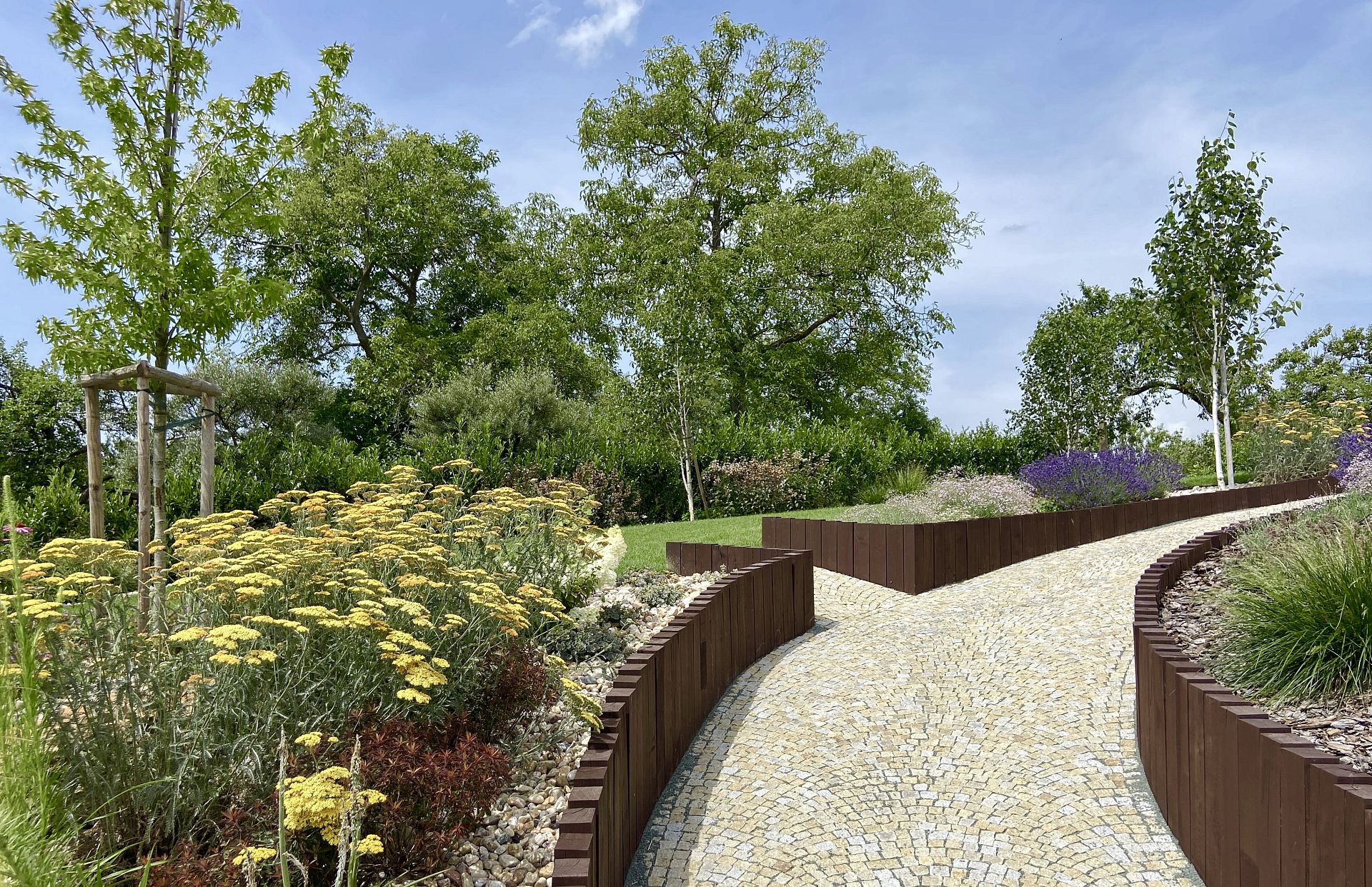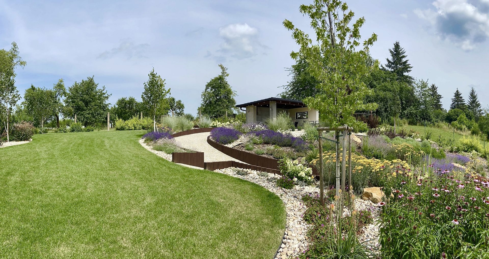 Hledáte inspiraci pro zahradu ve svahu? V Jaroměři jsme realizovali rozsáhlou zahradní proměnu svažité zahrady u rodinného domu, kde bylo hlavním cílem vyřešit výrazné výškové převýšení mezi obytnou částí domu a pergolou umístěnou v horní části pozemku. Požadavkem klienta bylo vytvořit plynule propojený zahradní prostor bez stavby schodů, s důrazem na pohodlný pohyb po zahradě, jednoduchou údržbu zahrady a celoroční estetický vzhled.