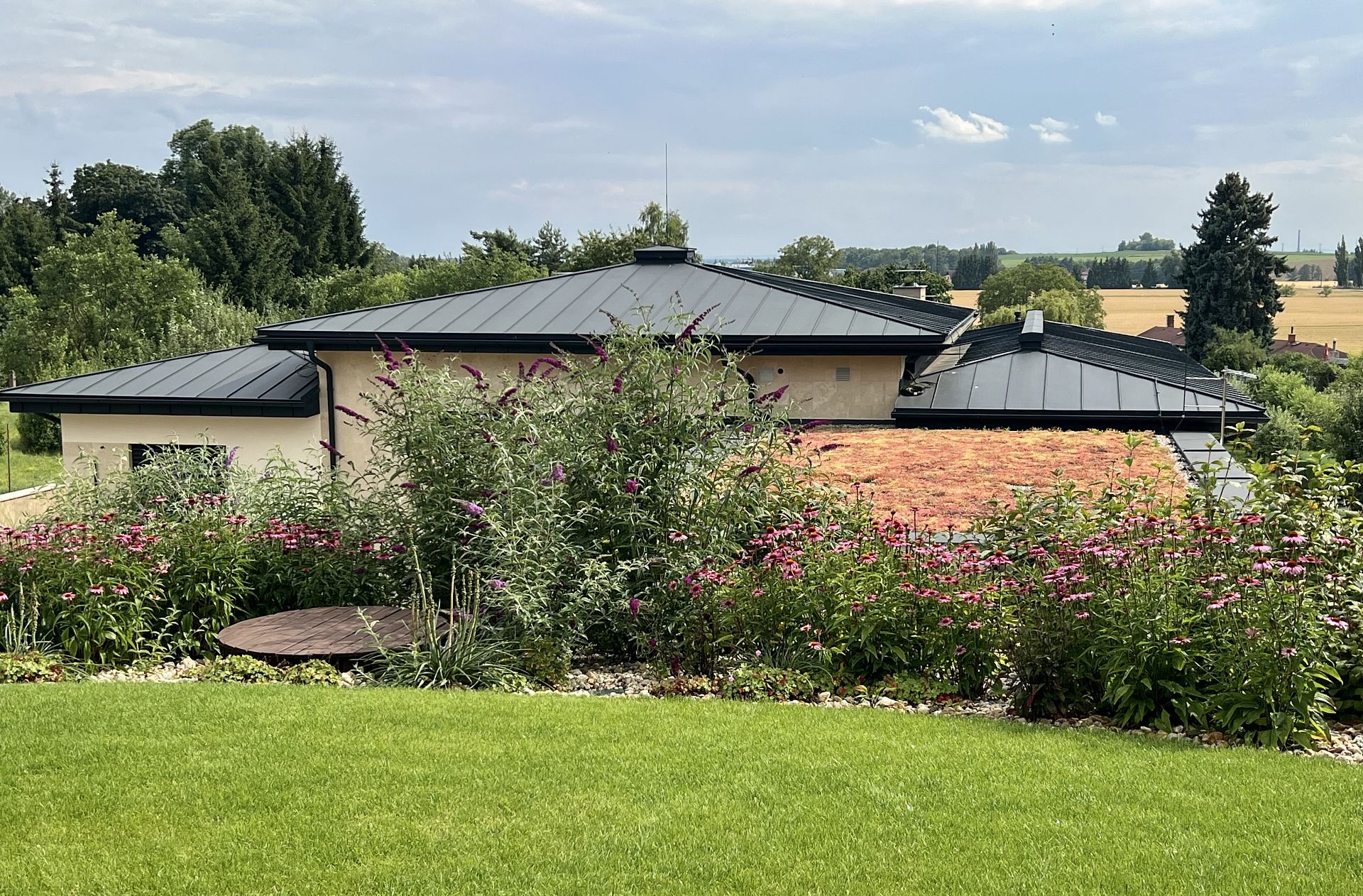 Do okrasné zahrady ve svahu jsme dále instalovali systém automatického zavlažování trávníku a záhonů, který zajišťuje rovnoměrnou závlahu zeleně a výrazně snižuje nároky na pravidelnou péči.