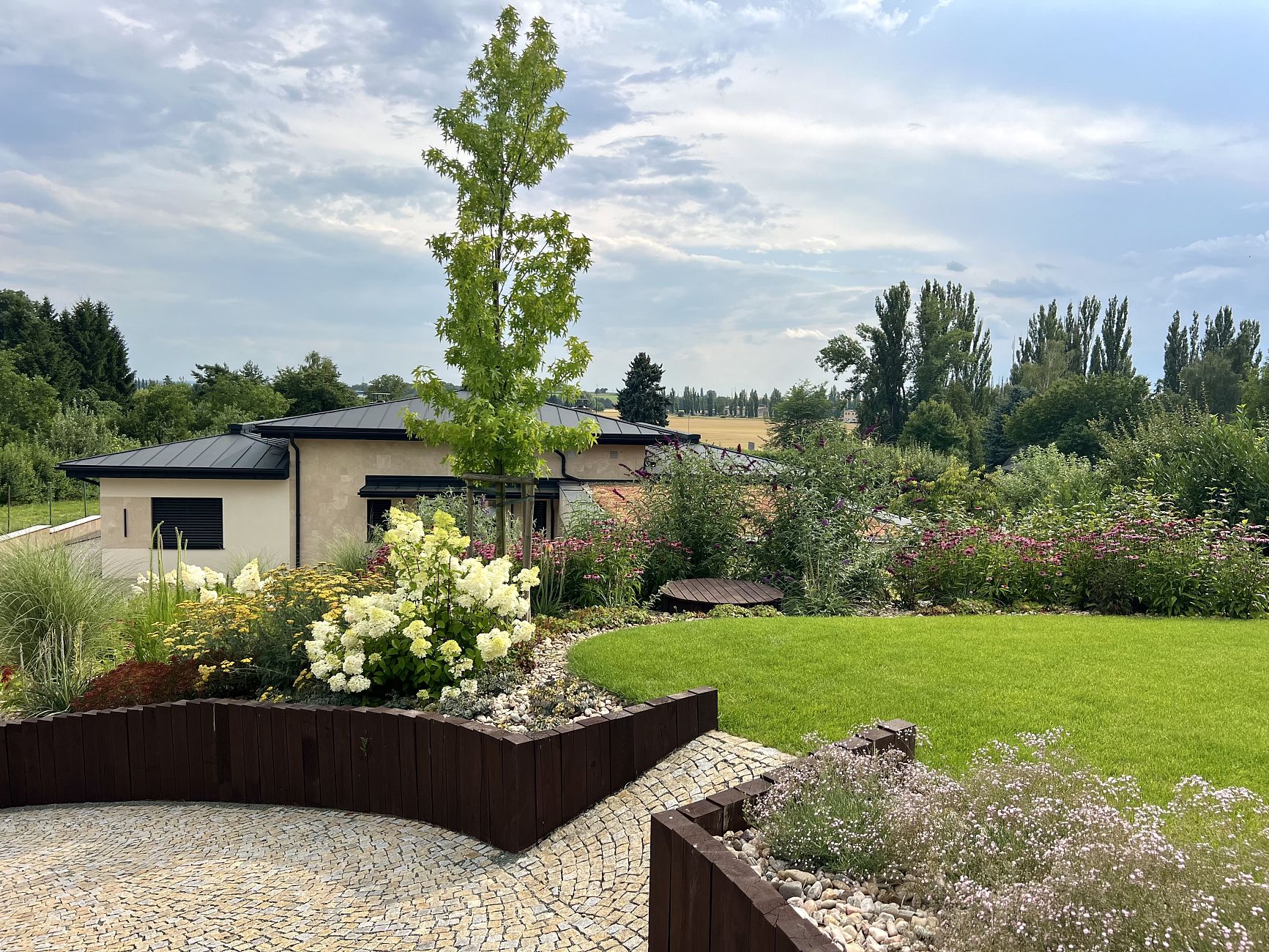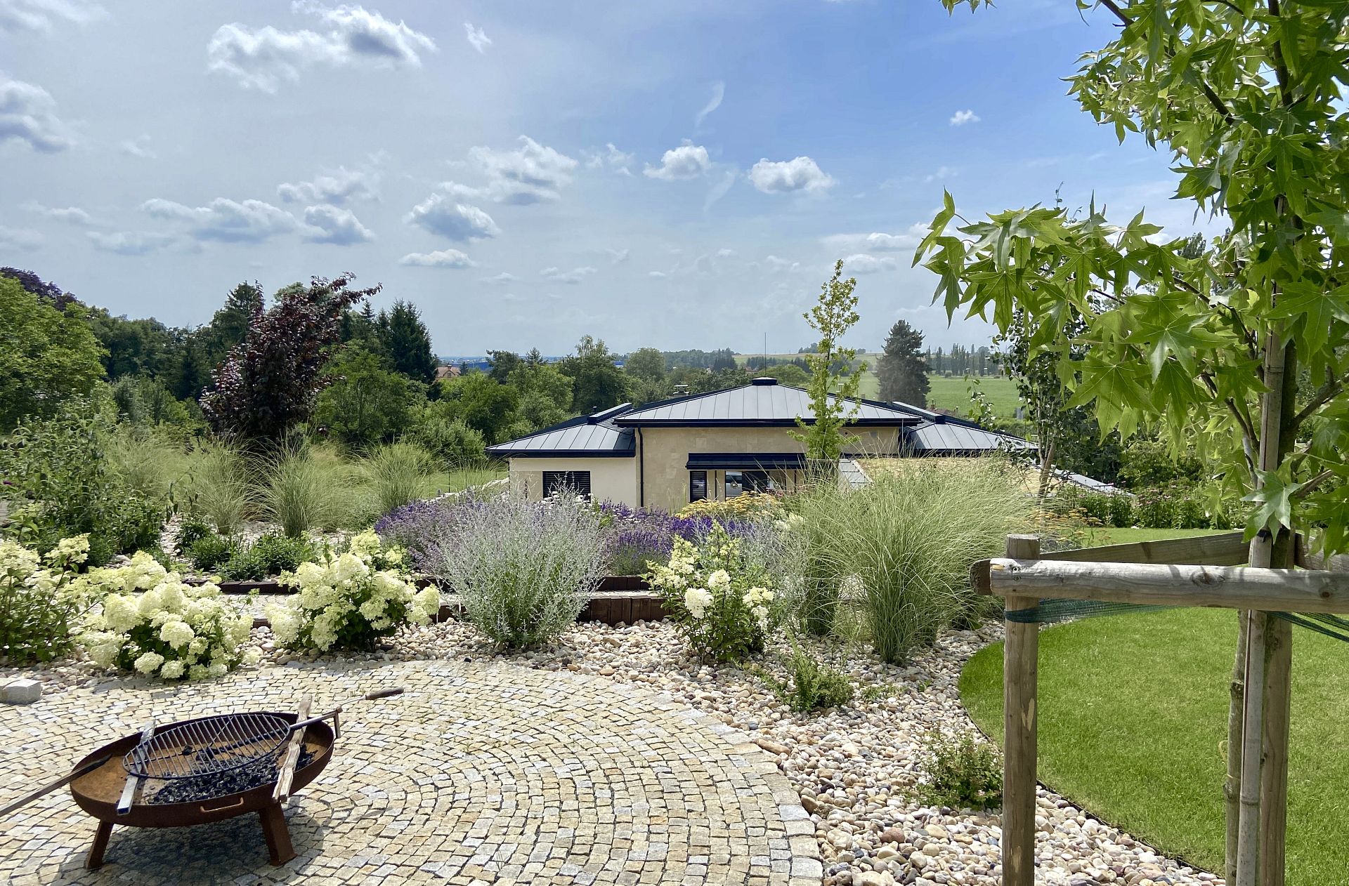 Výrazným prvkem zahrady se stalo cortenové grilovací ohniště, které přirozeně zapadá do konceptu moderní okrasné zahrady a vytváří ideální místo pro setkávání s rodinou a přáteli. V jeho okolí jsme provedli výsadbu rostlin a založení trávníku tak, aby zahrada nabízela atraktivní vzhled po celý rok.