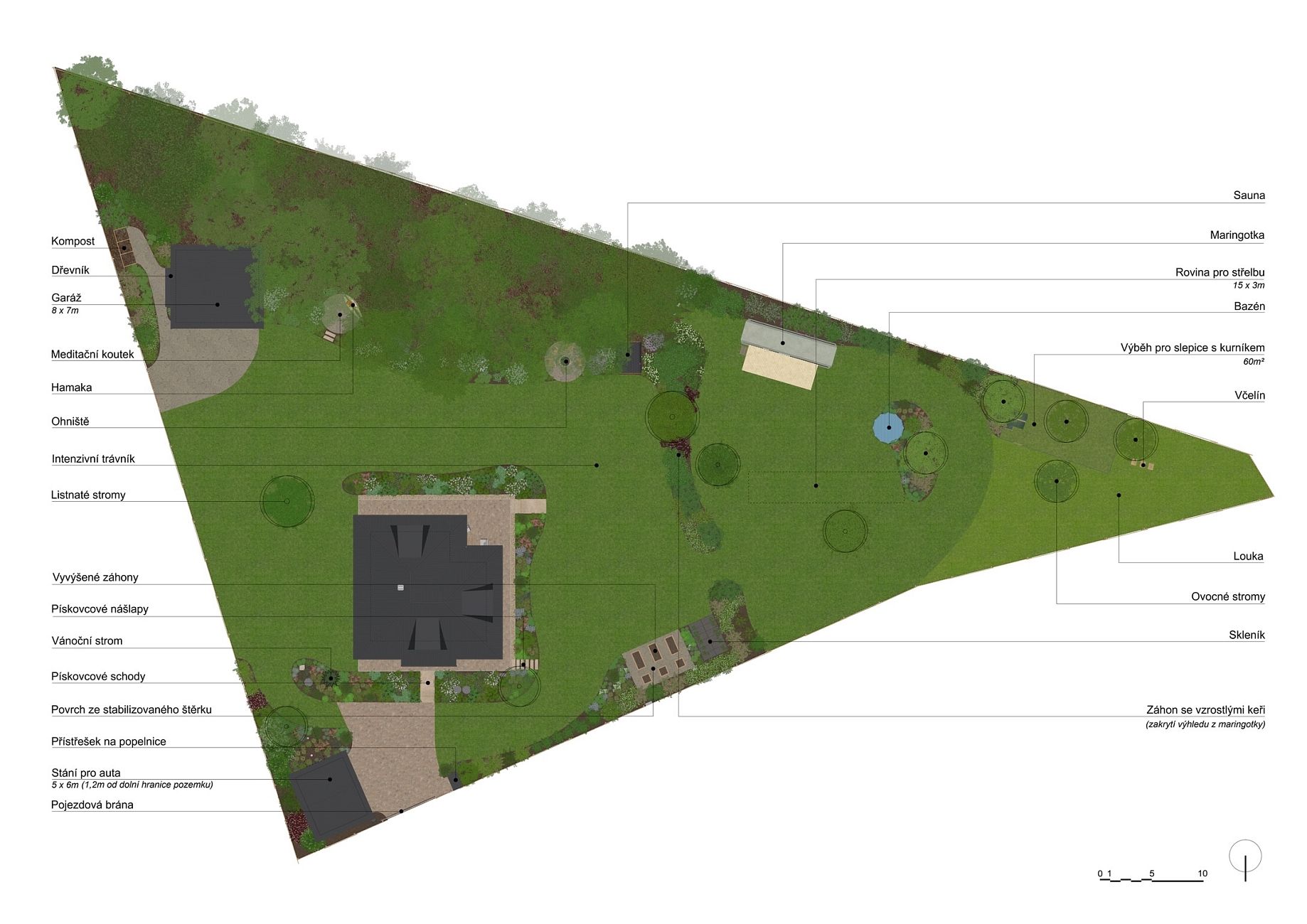 Projekt této zahrady vznikl s cílem vytvořit harmonický prostor navazující na okolní les a louku, který nabídne místo pro relaxaci, dětské hry i pěstování. Návrh zahrady respektuje přání majitelů ponechat velkou volnou plochu pro pohyb dětí a zároveň vytvořit klidová zákoutí pro odpočinek i každodenní život.
