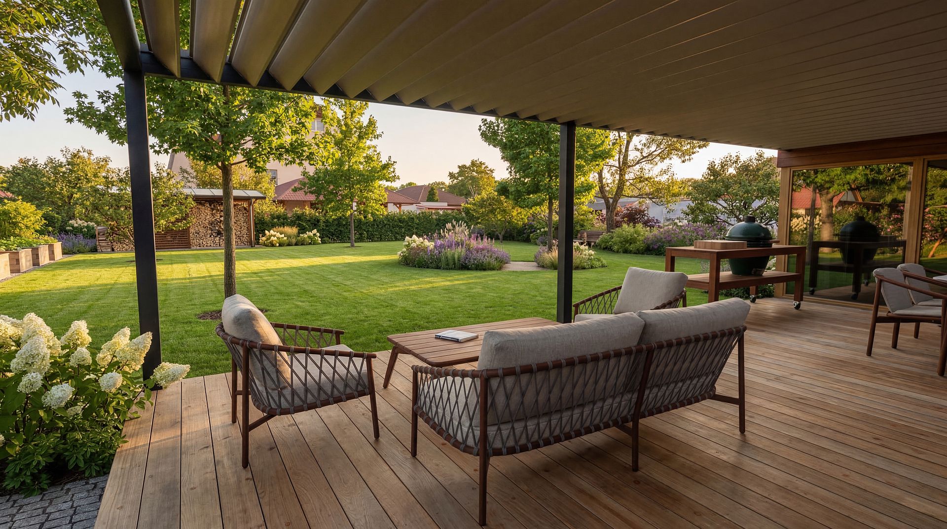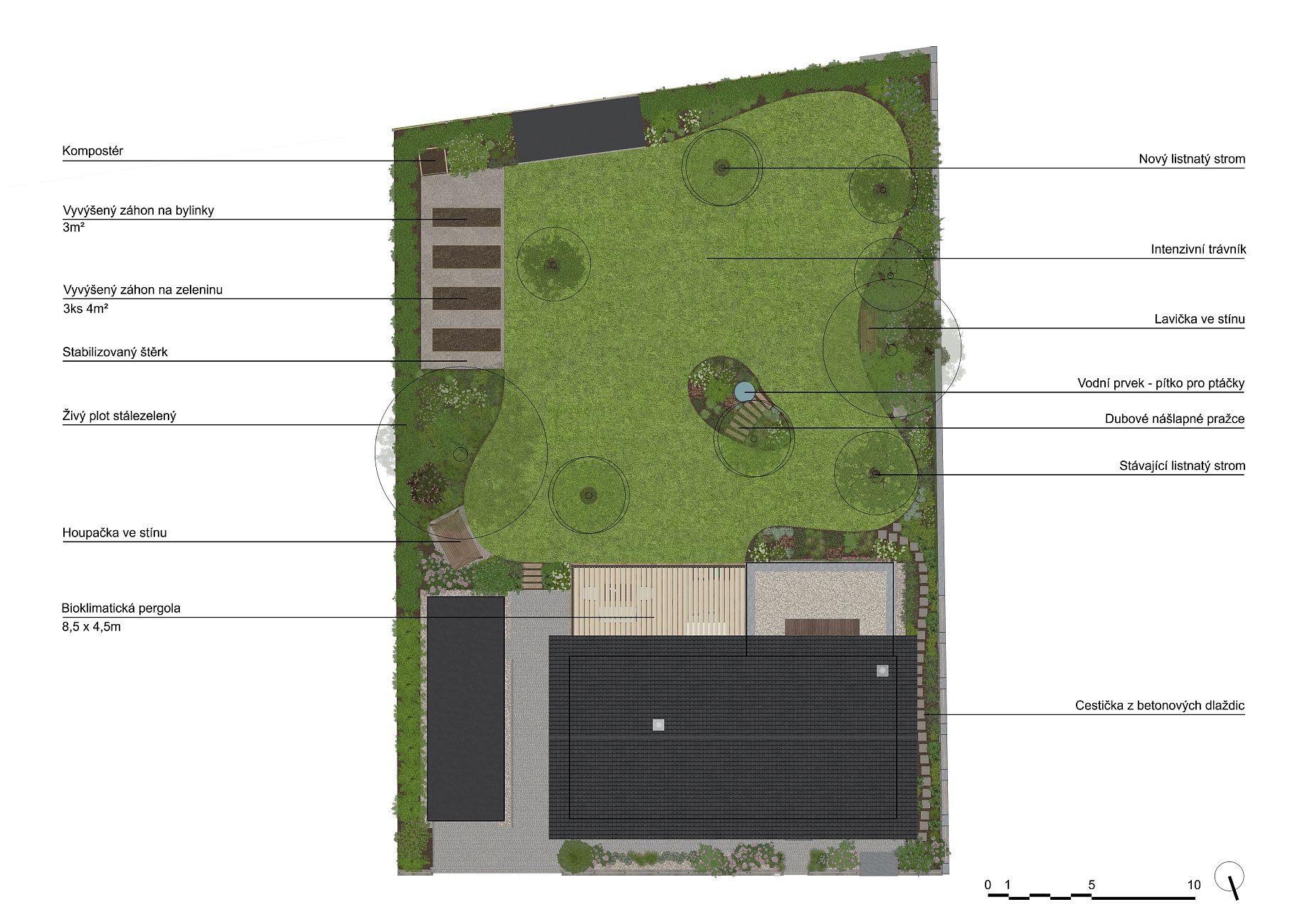 Projekt této zahrady vznikl s důrazem na rozšíření obytného prostoru domu a vytvoření komfortního zázemí pro každodenní život i relaxaci. Hlavním prvkem návrhu je zvětšená terasa doplněná o bioklimatickou pergolu, která poskytuje spolehlivé zastřešení a ochranu před sluncem i deštěm. Díky tomu vzniká plnohodnotný venkovní prostor pro posezení, stolování i vaření.