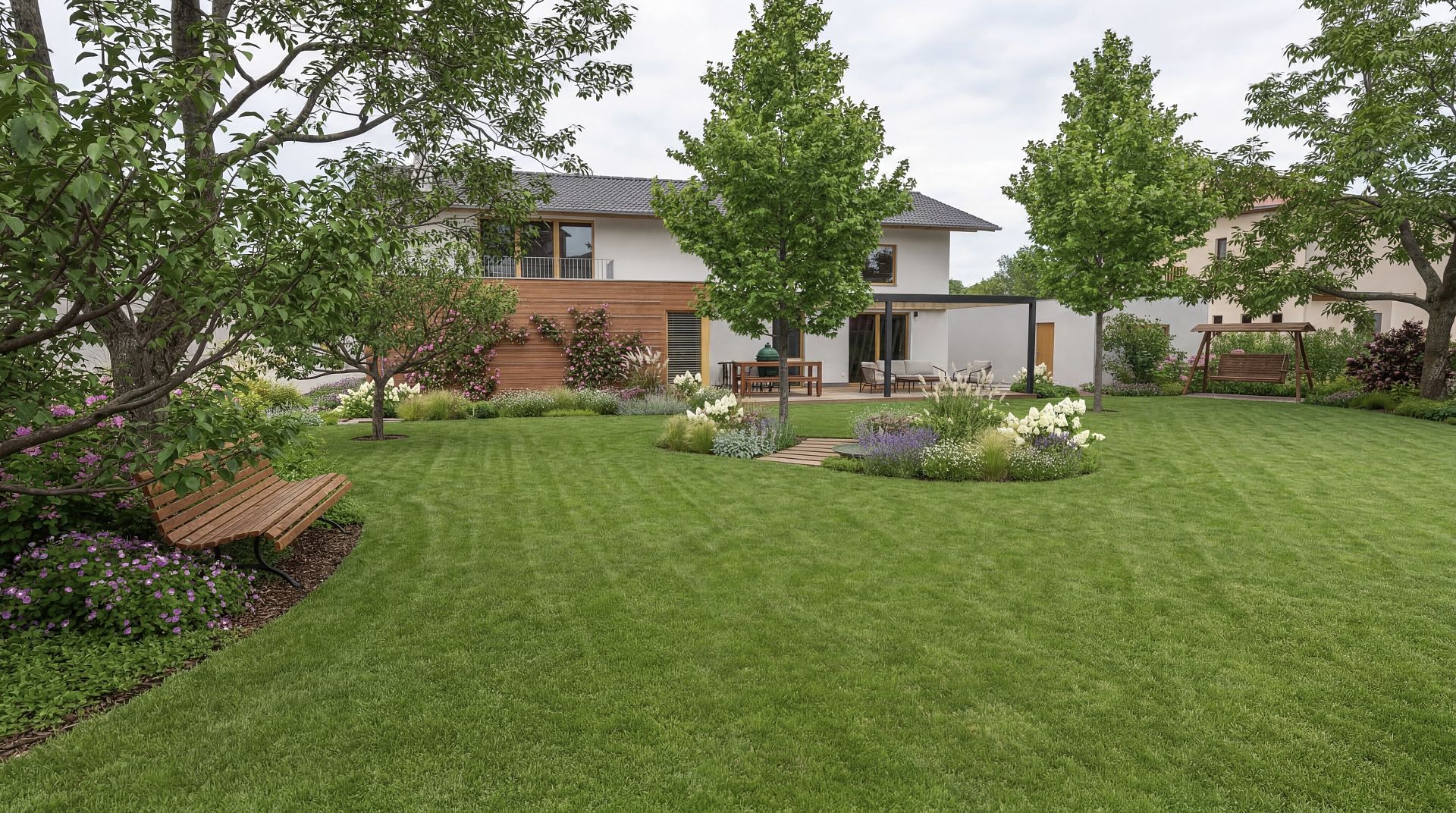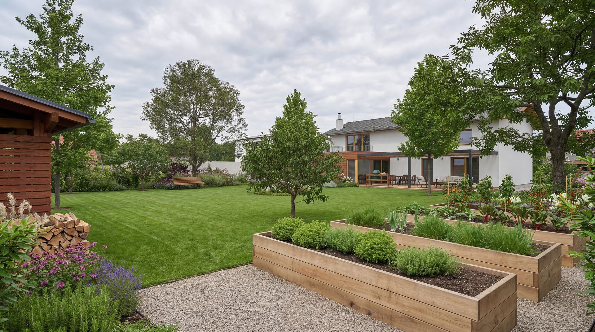 Výsledkem je moderní okrasná zahrada, která kombinuje užitkovou i relaxační funkci a nabízí ideální zázemí pro rodinný život.