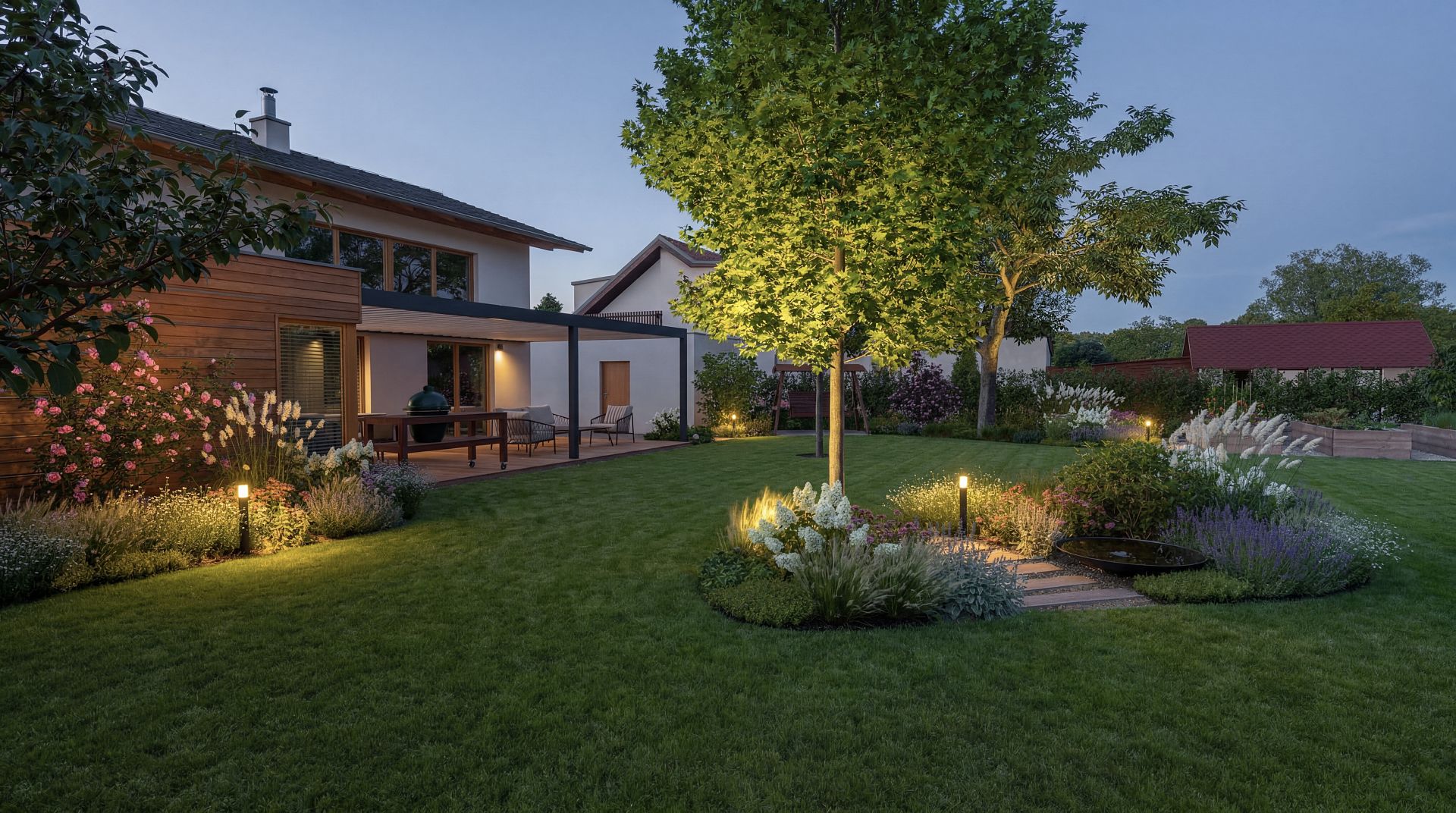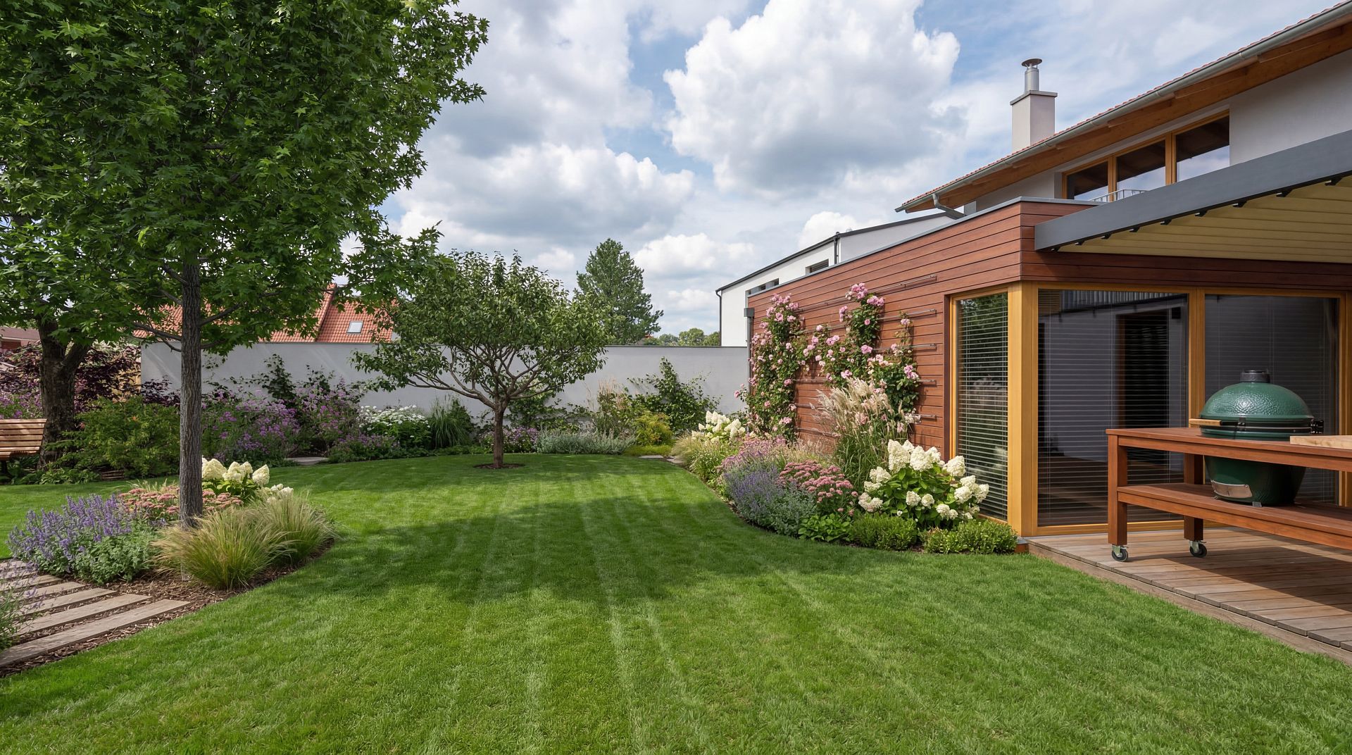 Na terase je navrženo praktické uspořádání sezení včetně místa pro grilování, kde vynikne ikonický Green Egg. Celý prostor působí přehledně a funkčně, přičemž navazuje na interiér domu a přirozeně rozšiřuje jeho obytnou plochu. Pro zajištění soukromí jsou využity jak stávající ovocné stromy, tak nově vysazené okrasné stromy, které spolu s výsadbou vytvářejí přirozenou zelenou clonu vůči sousedům.