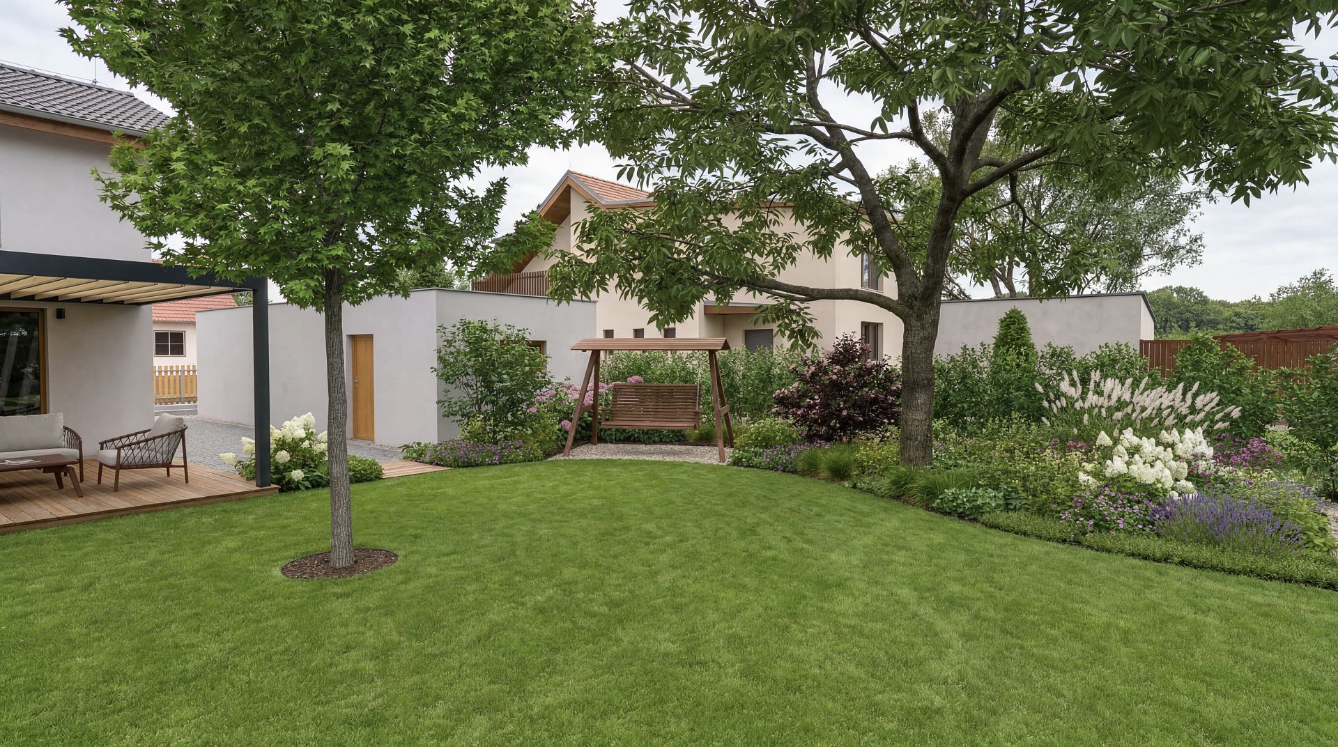 Zahrada si zachovává charakter původního ovocného sadu, který je doplněn o moderní prvky a čisté linie. Podél okrajů pozemku vzniká kompaktní výsadbový pás s okrasnými keři a trvalkami, do kterého jsou citlivě integrovány funkční prvky jako lavička, houpačka i užitková část. Díky tomu působí prostor sjednoceně a jednotlivé části na sebe plynule navazují.